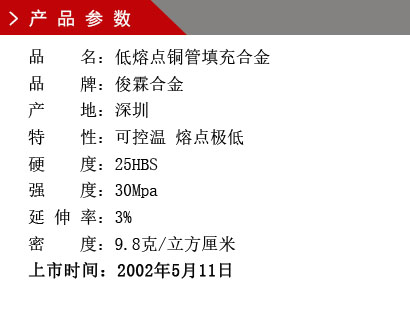 俊霖銅管填充合金是易熔合金,低熔點(diǎn)合金,也稱模具合金是用鉍、鉛、錫和鎘等元素制成的合金.一種特制的多元共晶金屬,凝固后可馬上投入生產(chǎn)使用,用相同溫度的熱水或油浸泡注有易熔合金的工件,很容易將低溫合金從模具上,固定夾具或零件中回收并可循環(huán)使用,且熱膨脹系數(shù)極低。使用方法簡(jiǎn)單,成本低。